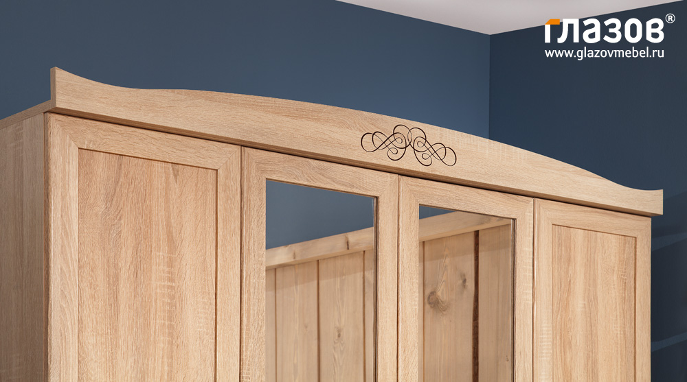 Вместительные шкафы позволят разместить в спальне весь Ваш гардероб. ADELE 9 Шкаф для одежды и белья выигрышно смотрится с карнизом, который придает шкафу изюминку и подчеркивает выбранный стиль Прованс, но и без него, с декоративной раскладкой на дверцах, выглядит тоже прекрасно.