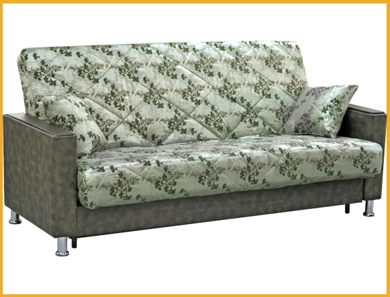 Современный строгий стиль. Съемный чехол на спальном месте. Декоративные ламинированные прямолинейные накладки на подлокотниках. Сиденье и спинка сформированы на основе металлокаркаса с деревянными латами, на котором закреплен мягкий мат, внутри которого располагается пружинный блок с настилом из термовойлока и листового пенополиуретана и соединены между собой трехпозиционным узлом трансформации. В коробчатом основании расположена емкость для хранения спальных принадлежностей. Комплектуется декоративными подушками. Для трансформации требуется расстояния между стеной и диваном. Механизм раскладки "клик- кляк".
