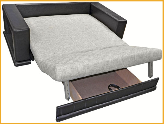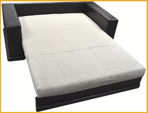 Современный стиль. Ровное спальное место. В основании дивана металлический каркас с поддерживающими деревянными латами и механизмом трансформации «аккордеон». Матрас на эластичном ППУ. Спальное место формируется следующим образом: цокольная часть сиденья выдвигается вперед до упора, спинка, состоящая из сложенного листового пенополиуретана, раскладывается. Для трансформирования не требуется расстояние между стеной и диваном. Съемный чехол на спальном месте.Мягкие прямолинейные подлокотники, в нише которых крепятся вставки из ЛДСП. Имеется небольшая емкость для хранения спальных принадлежностей.