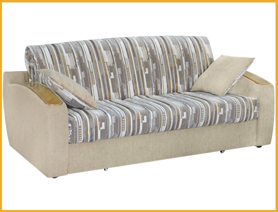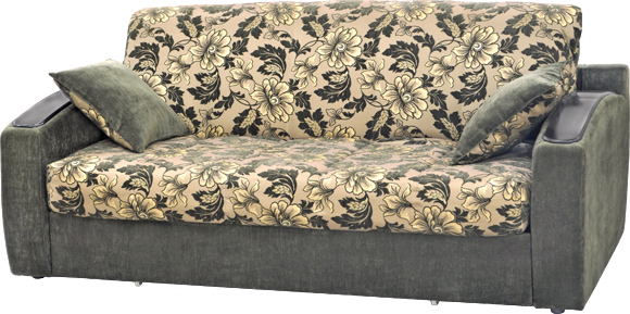 Современный стиль. Ровное спальное место. В основании дивана металлический каркас с поддерживающими деревянными латами и механизмом трансформации «аккордеон». Матрас на эластичном ППУ. Спальное место формируется следующим образом: цокольная часть сиденья выдвигается вперед до упора, спинка, состоящая из сложенного листового пенополиуретана, раскладывается. Для трансформирования не требуется расстояние между стеной и диваном. Съемный чехол на спальном месте.Изящные криволинейные подлокотники выполнены с декоративными накладками. Имеется небольшая емкость для хранения спальных принадлежностей.Комплектуется декоративными двухсторонними подушками.