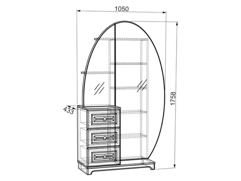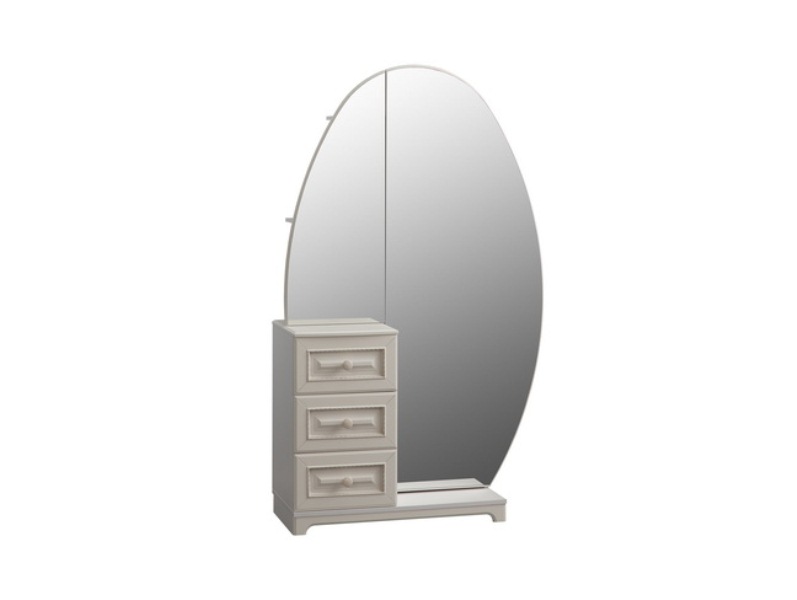 Состоит из: 3-х выдвижных ящиков, зеркала, стеллажа с полками, расположенный за зеркалом.