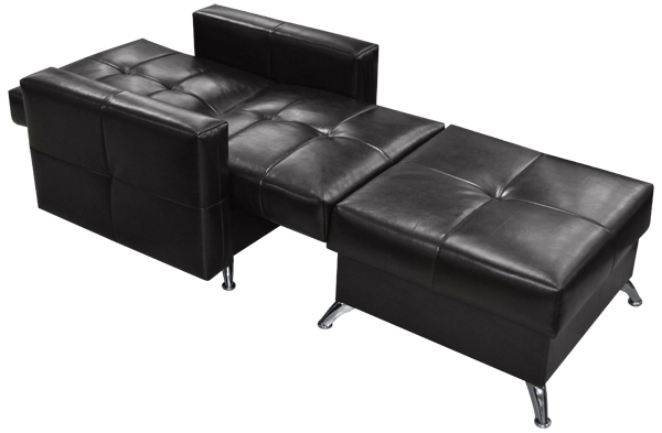 Современный строгий стиль. Прямоугольные подлокотники. Сиденье и спинка сформированы на основе металлокаркаса с деревянными латами, на котором закреплен мягкий мат из листового пенополиуретана и соединены между собой трехпозиционным узлом трансформации. В коробчатом основании расположены емкости для хранения спальных принадлежностей, выполненные из ЛДСП. При использования кресла совместо с пуфом образуется спальное место.