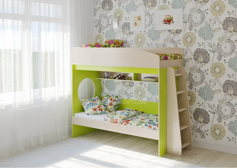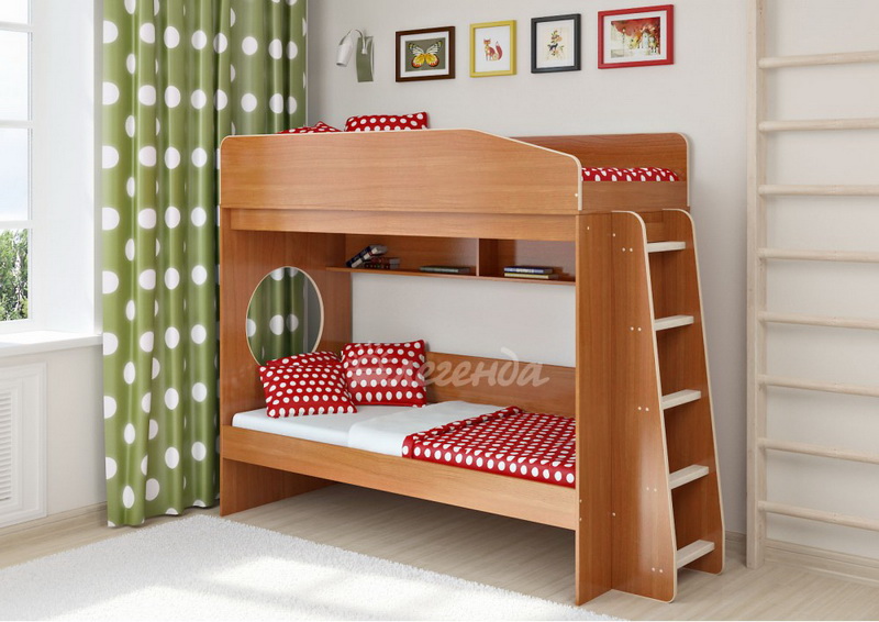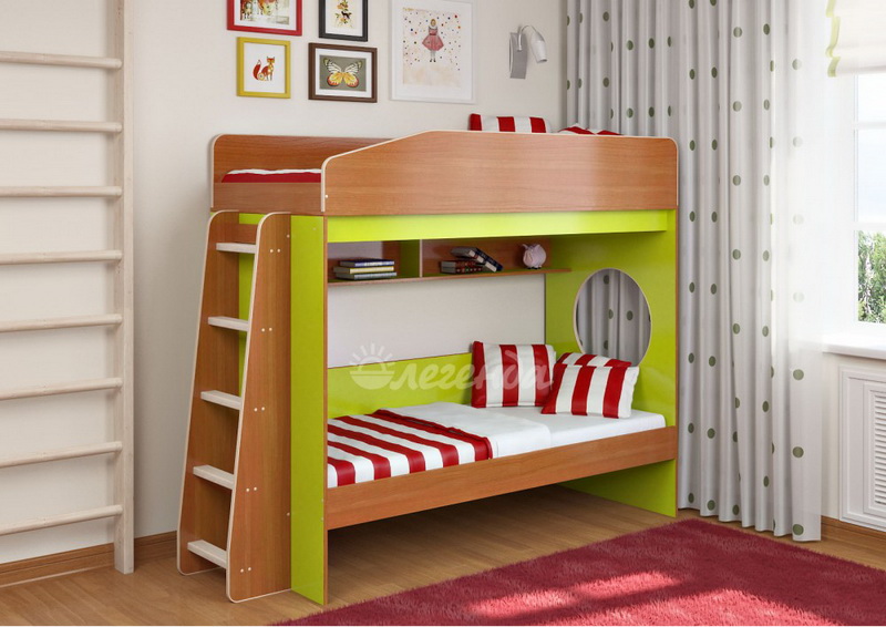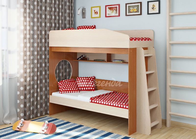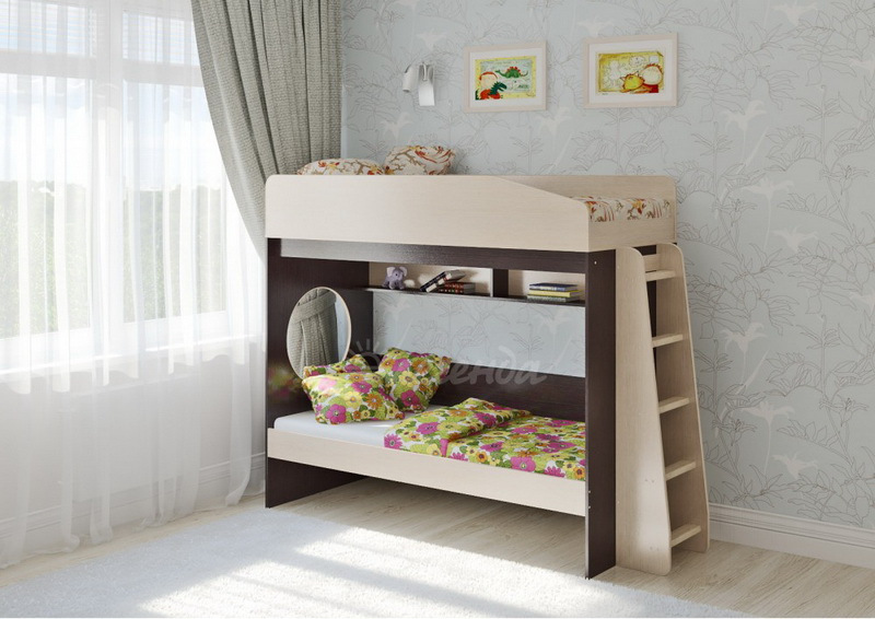 Над нижним спальным местом располагается встроенная двухсекционная полка, в которой удобно хранить книги, учебники, тетради, канцелярию и другие нужные вещи.