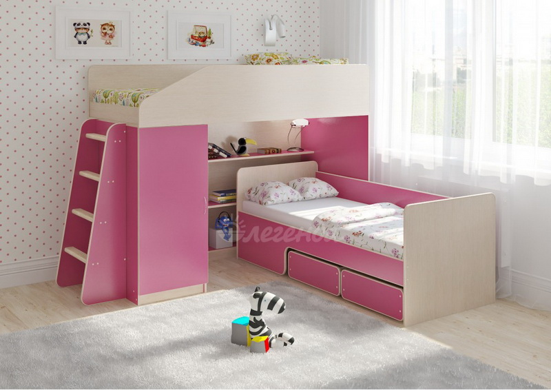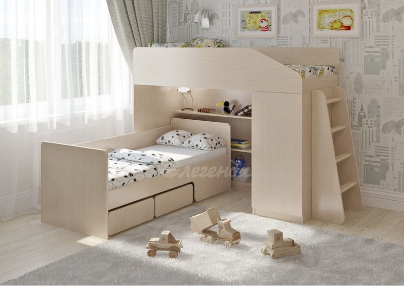 Под верхним спальным местом располагается стеллаж,состоящий из трех полок. Вместительный шкаф с четырьмя полками и штангой для хранения одежды,белья,игрушек или иных вещей.