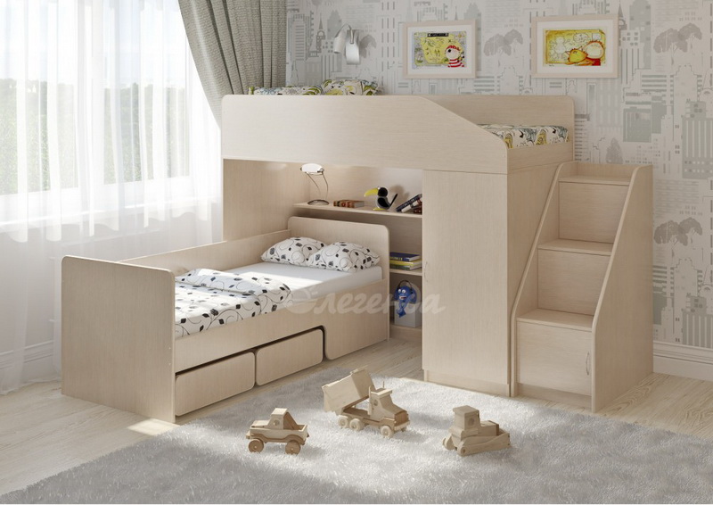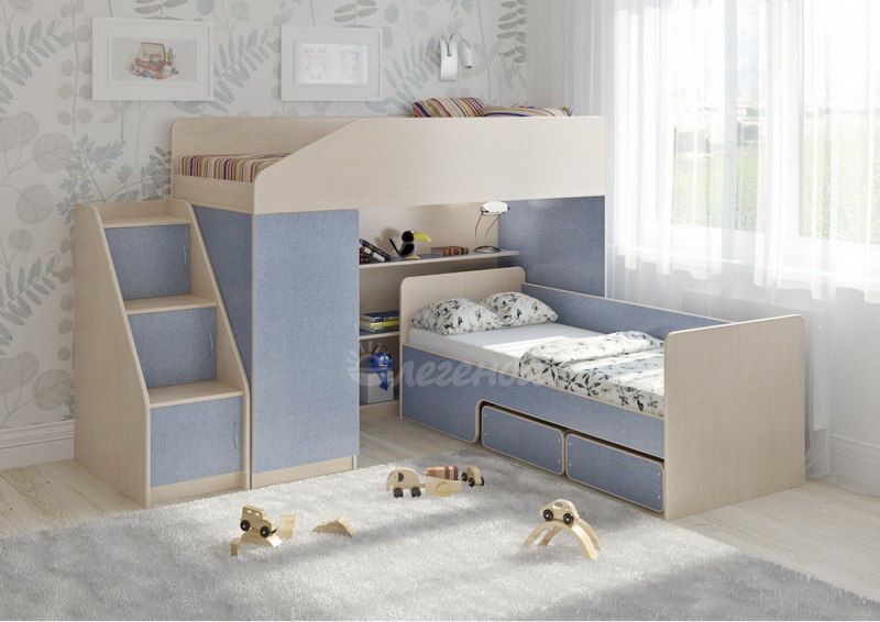 Под верхним спальным местом располагается стеллаж,состоящий из трех полок.Стеллаж отлично подходит для хранения игрушек,удобен для поддержания порядка и сортировки предметов.