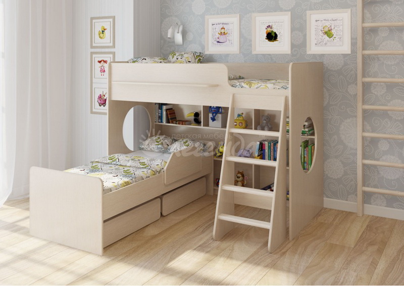 Под верхним спальным местом в игровой зоне располагается стеллаж. Стеллаж отлично подходит для хранения игрушек,удобен для поддержания порядка и сортировки предметов.