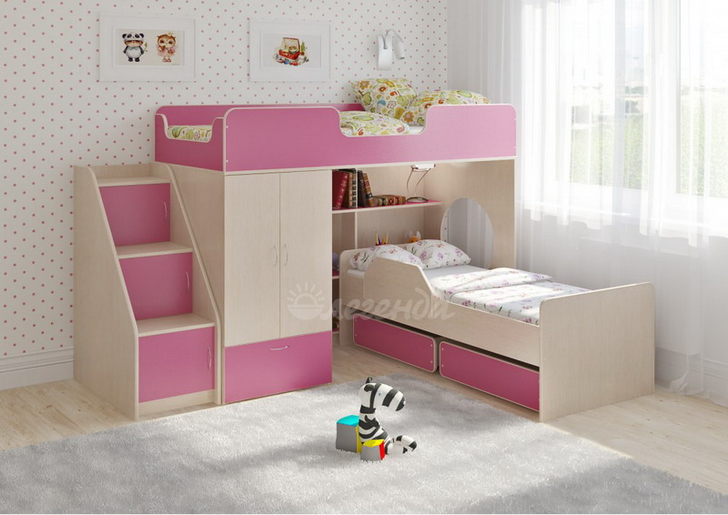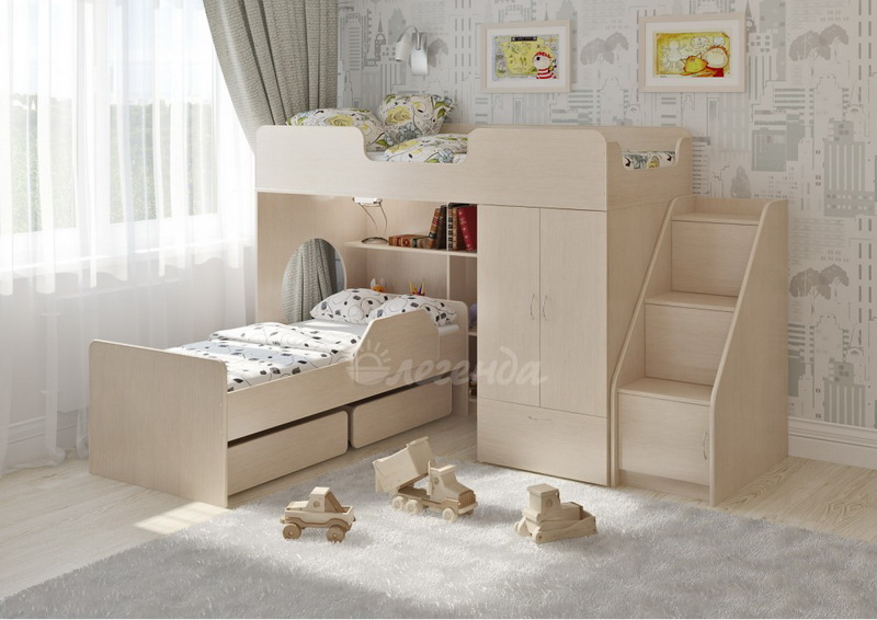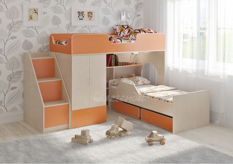 Под верхним спальным местом располагается стеллаж,отлично подходящий для хранения игрушек.Стеллаж состоит из трех полок,разделенных на две секции – удобно для поддержания порядка и сортировки предметов.