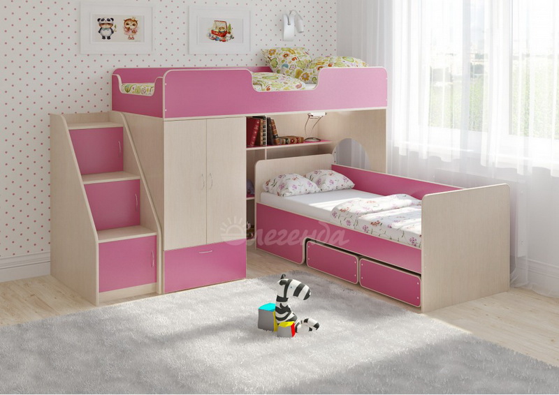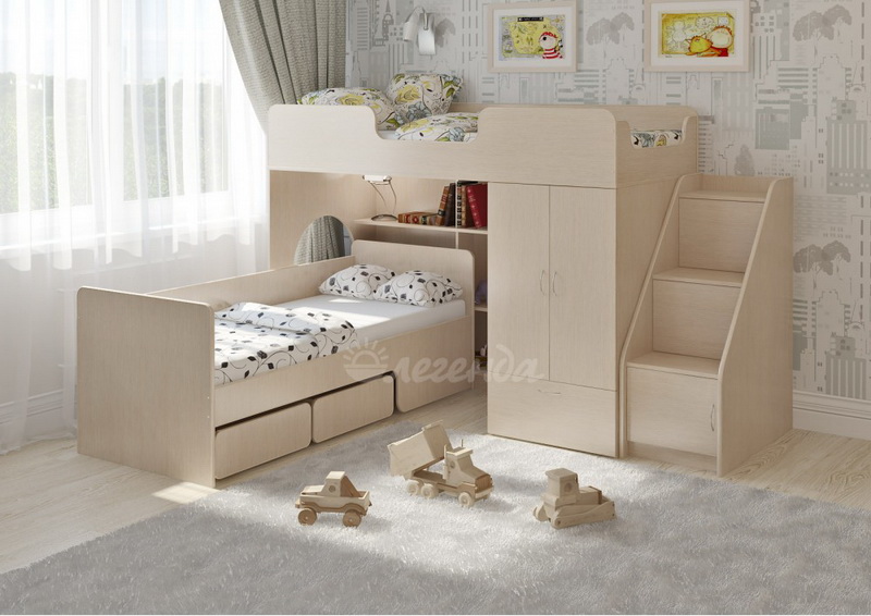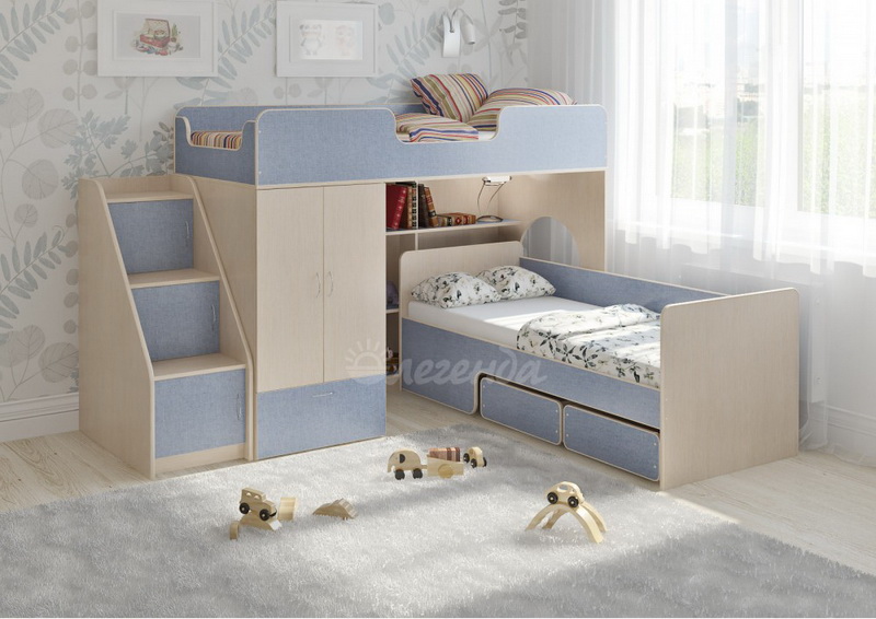 Под верхним спальным местом располагается стеллаж,отлично подходящий для хранения игрушек.Стеллаж состоит из трех полок, разделенных на две секции – удобно для поддержания порядка и сортировки предметов.