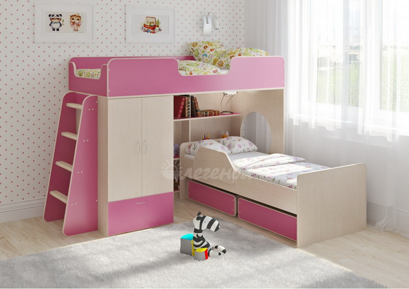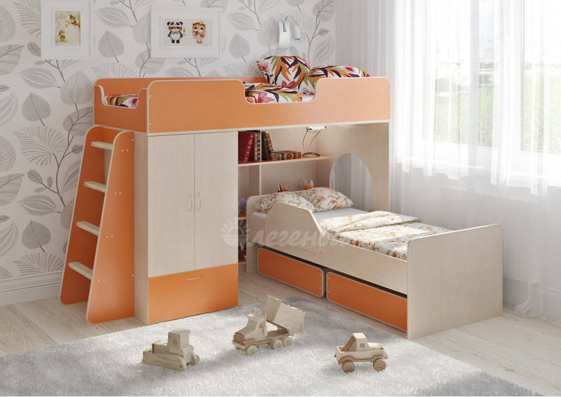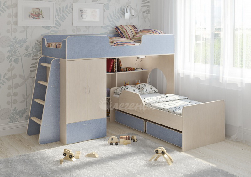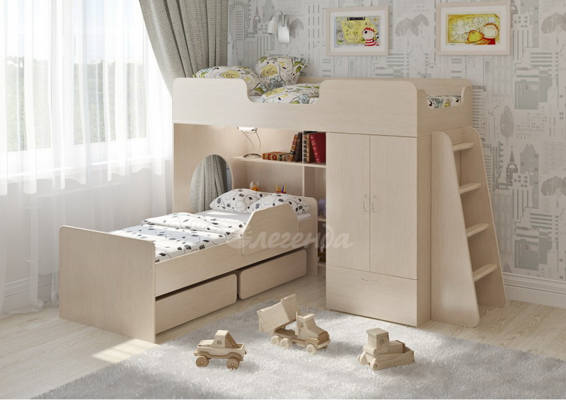 Под верхним спальным местом располагается стеллаж,отлично подходящий для хранения игрушек.Стеллаж состоит из трех полок,разделенных на две секции – удобно для поддержания порядка и сортировки предметов.