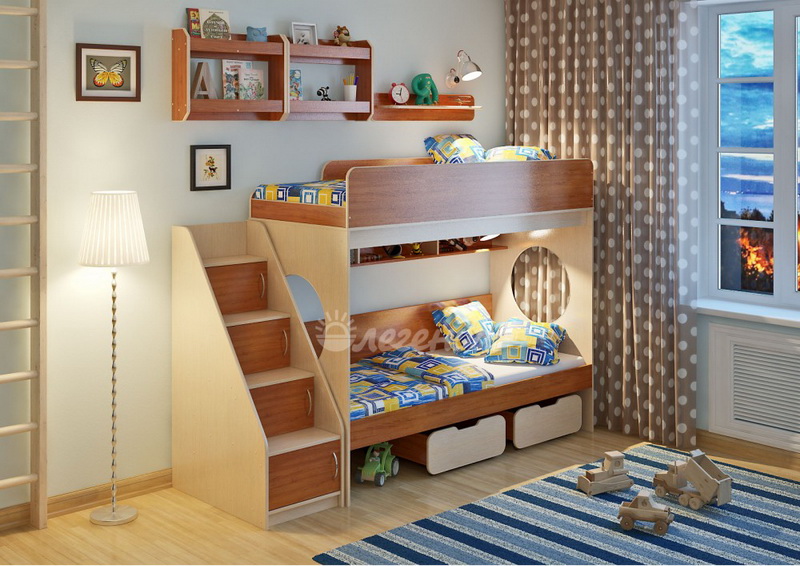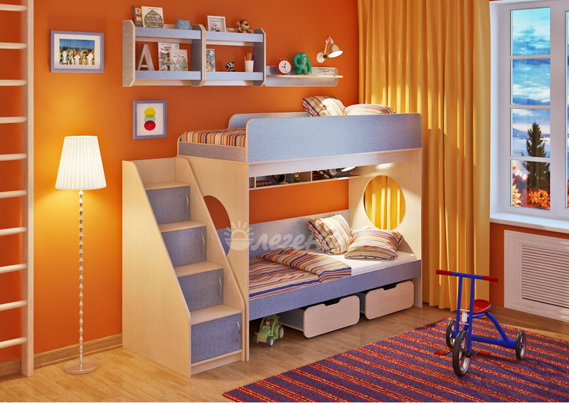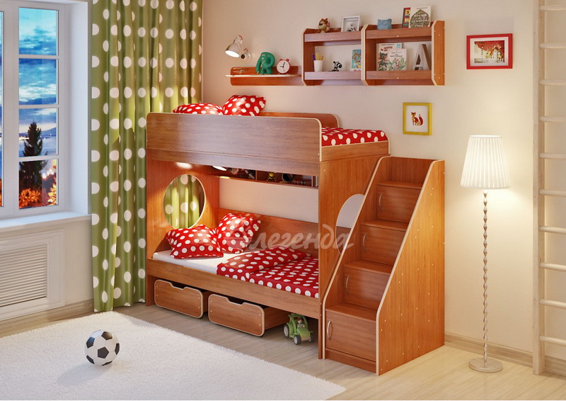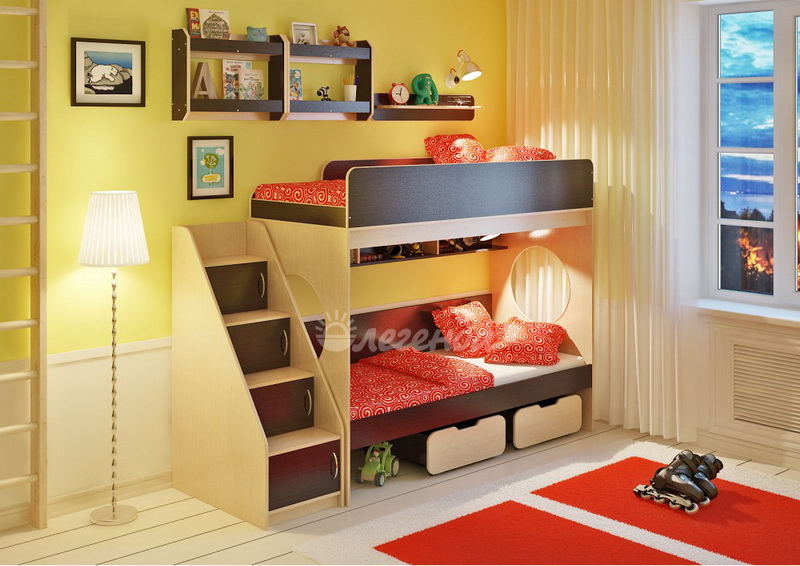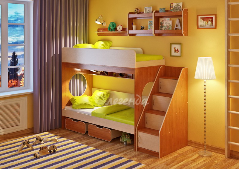 Над нижним спальным местом располагается встроенная трёхсекционная полка,в которой удобно хранить книги,учебники,тетради,канцелярию и другие нужные вещи.