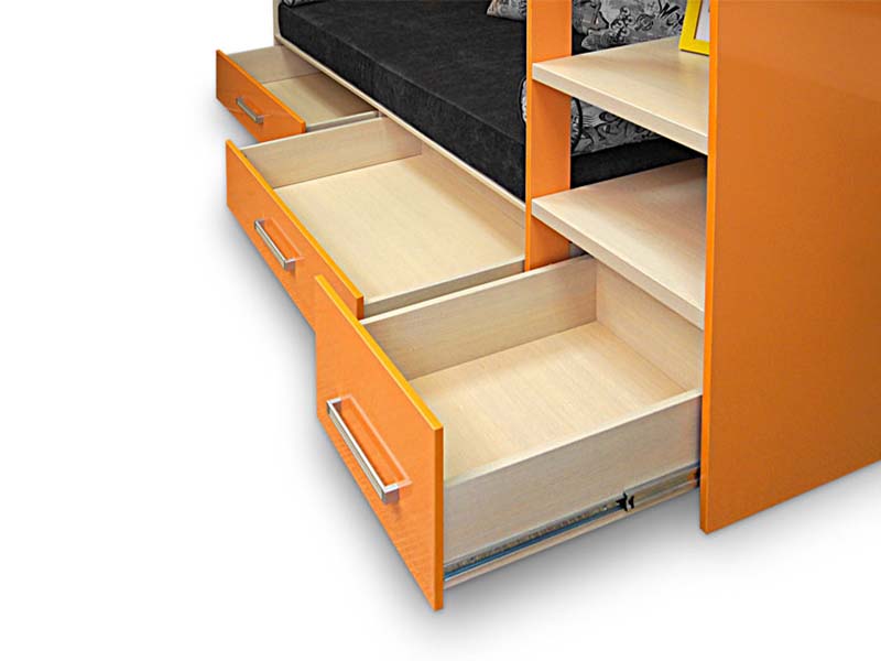 Оригинальное исполнение кровати - на нижнем ярусе расположен диван, на верхнем ярусе кровать. Удобный вариант для подростков, которые любят приглашать друзей и при этом поддерживать порядок в комнате.