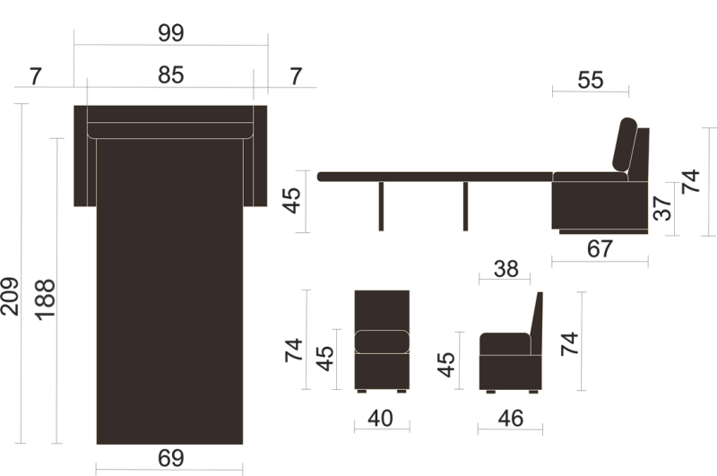 Модель без спального места, со скрытым ящиком. Вместо трансформирующейся в спальное место секции может быть сделан ящик.