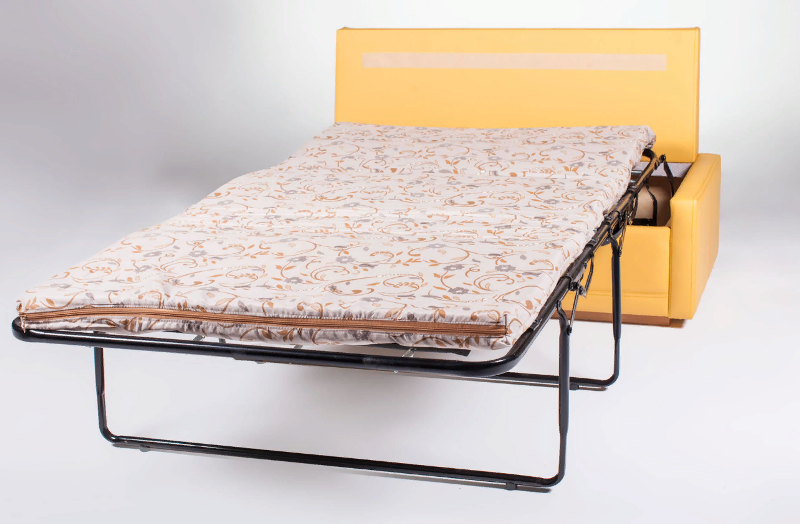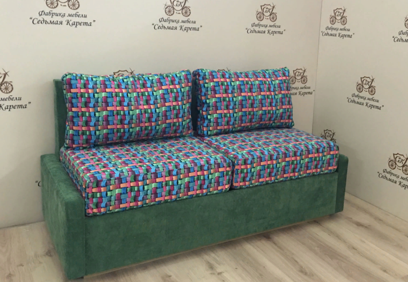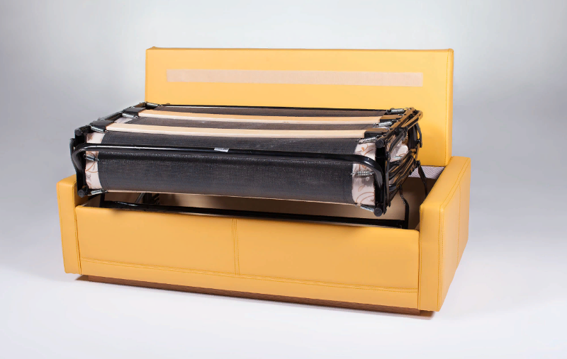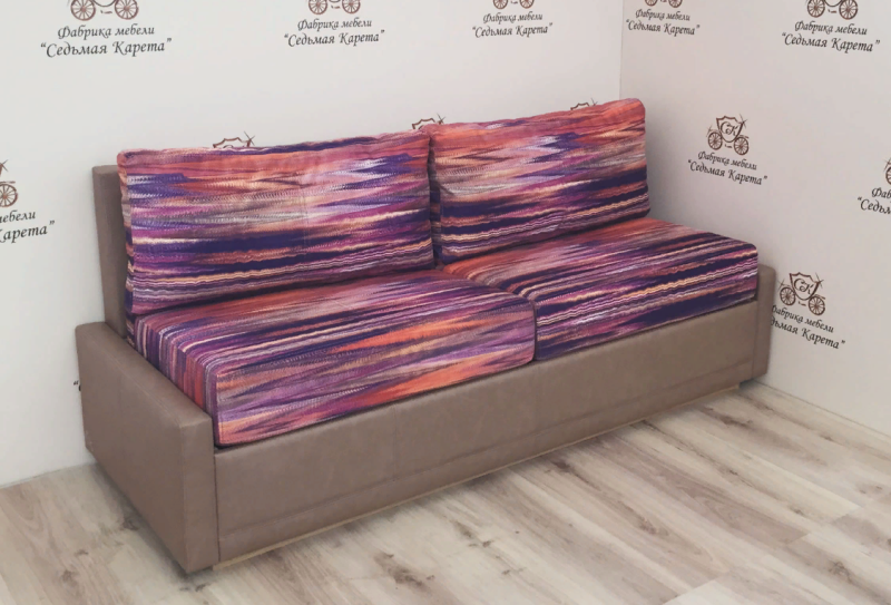 Диван имеет механизм трансформации «французская раскладушка» Механизм трансформации весьма прост и требует минимальных усилий: достаточно снять подушки и поднять конструкцию спального места за специальную ручку в передней части раскладушки, после чего, установленный горизонтально механизм раскладушки дважды разворачивается и устанавливается на опорные ножки. При раскрытии раскладушки, ножки автоматически раскладываются и жёстко удерживаются на полу с небольшим наклоном вперёд. Данный механизм трансформации обеспечивает дивану компактность в сложенном виде и достаточно просторное спальное место в разложенном.