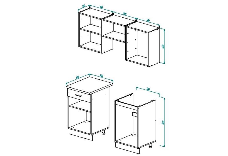 В комплекте: три навесных шкафа и две напольные тумбы.