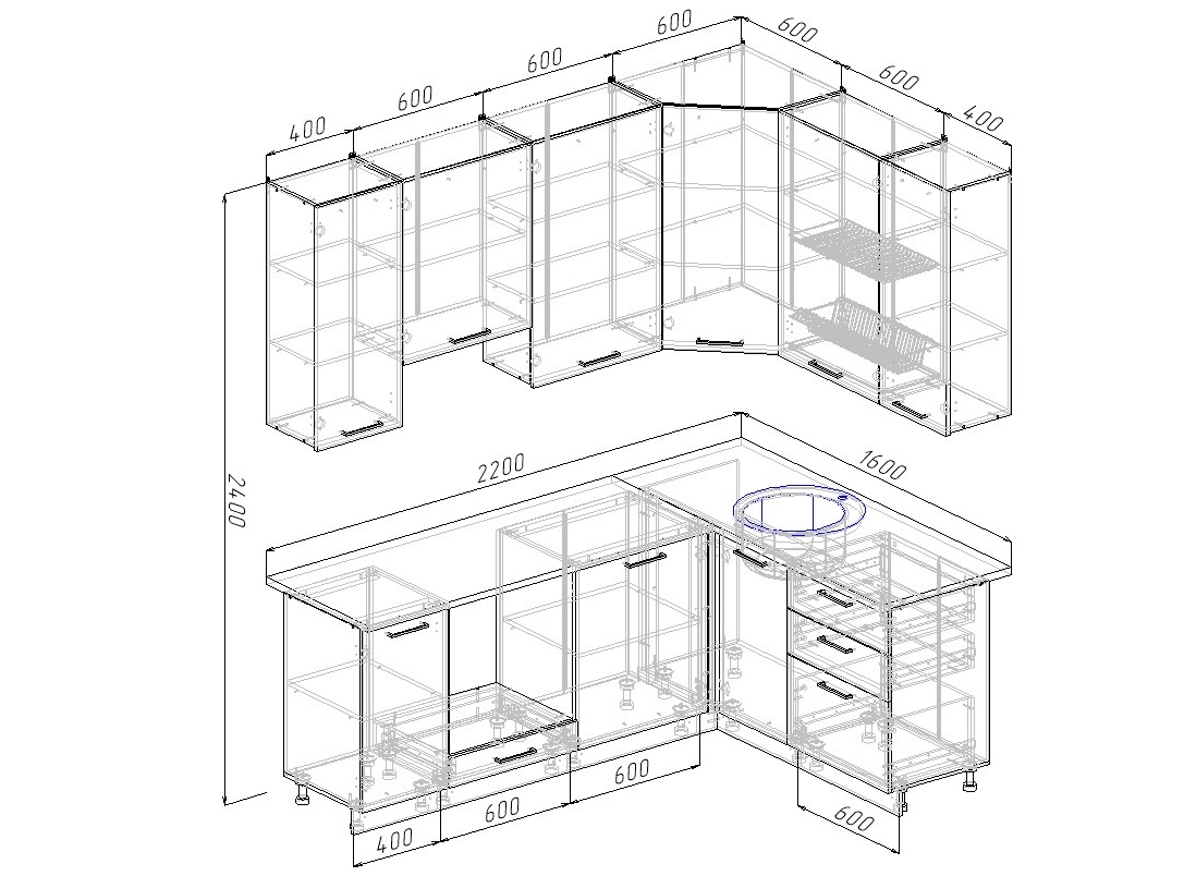Корпус нижний 1000х470х824 МН100 угловой с полкой  1шт