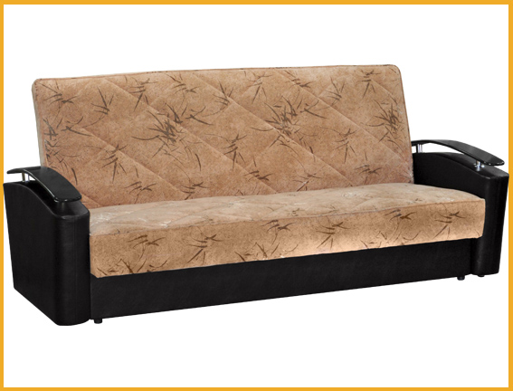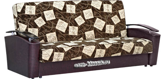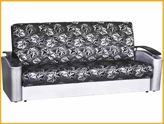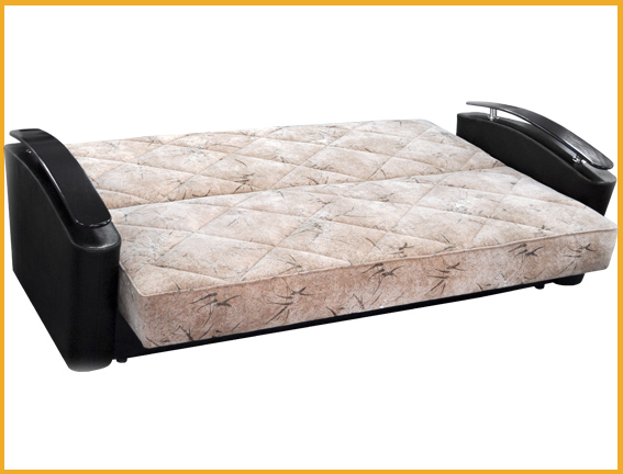 Современный стиль. Ровное спальное место. Боковины дугообразной формы, при помощи хромированных элементов на них установлены декоративные подлокотники. При трансформации дивана требуется расстояние между стеной и диваном. В основании короба имеется емкость для хранения спальных принадлежностей. Сиденье и спинка сформированы на основе деревянных рамок и на основе пружинных блоков соединены между собой настилом из эластичного листового пенополиуретана и соединенных между собой механизмом трансформации «книжка».