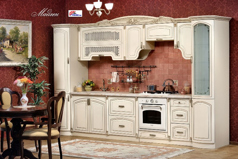 Модель кухни «Мадлен» представлена классическом стиле, сдержанные спокойные аксессуары;