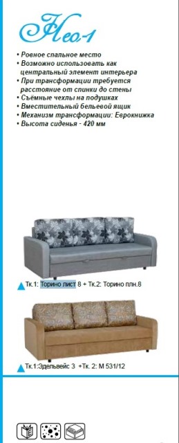 Именно это главное достоинство Нео-1. Эта модель качественна, грамотно детализирована, с несложным механизмом трансформации «еврокнижка», мягкие элементы облицованы эластичным листовым  ППУ, мягкие подушки наполнены крошкой ППУ. Но главное – доступна, способна доставить радость даже взыскательному покупателю. А благодаря тому, что цветовое исполнение может быть разным, модель без проблем впишется в любой интерьер.
