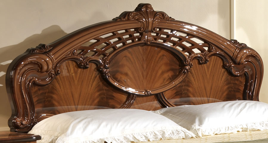 Кровать с красиво украшенными изголовьем и изножьем выглядит солидно. Все лицевые поверхности шкафа, комода, тумб, кровати покрыты высокоглянцевым лаком. А специально подобранные декоры красного дерева (могано) и ореха сияют при естественном и домашнем освещении.