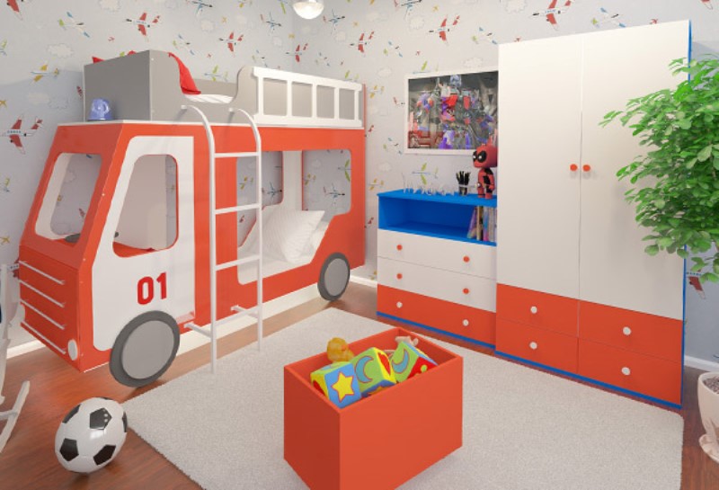 Серия Пожарный- новая модель детской. Каждый модуль продается отдельно: двухярусная кровать, комод 900, пеленальная доска к комоду, тумба 3 ящика на колесах, стол, шкаф широкий 2 двери, шкаф открытый, шкаф открытый с ящиками, шкаф открытый с дверью, шкаф узкий, ящик для игрушек, руль для машины, светильник Мигалка, подсветка.