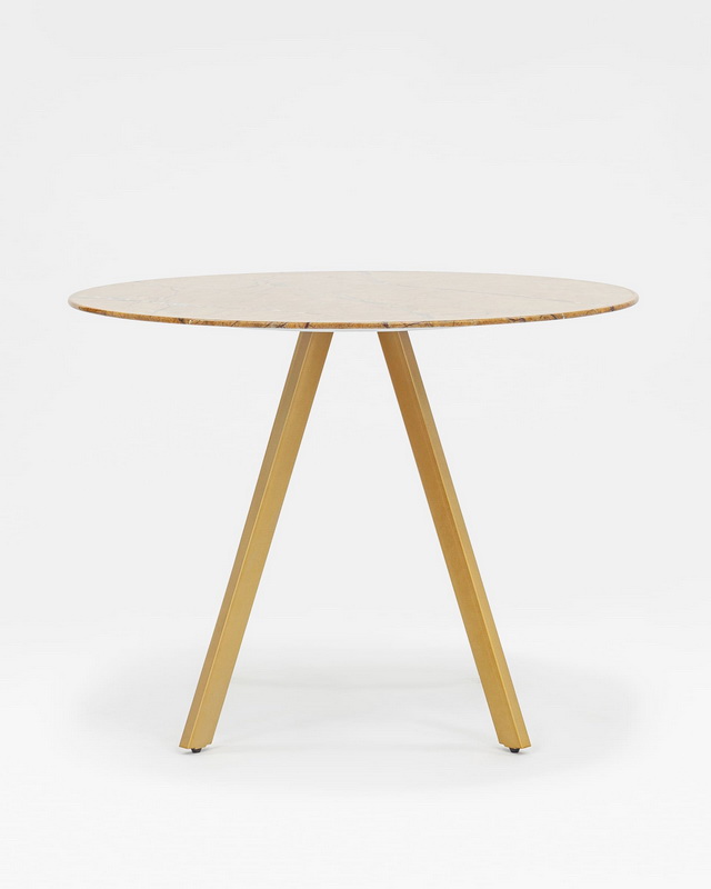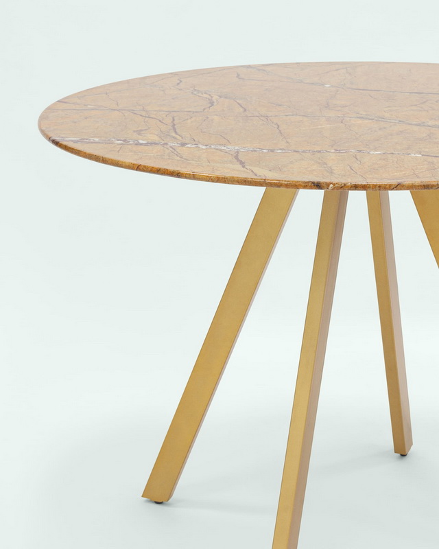 Обеденный стол с красивой стеклянной круглой столешницей цвета охры с рисунком под мрамор. Диаметр столешницы 100 см.