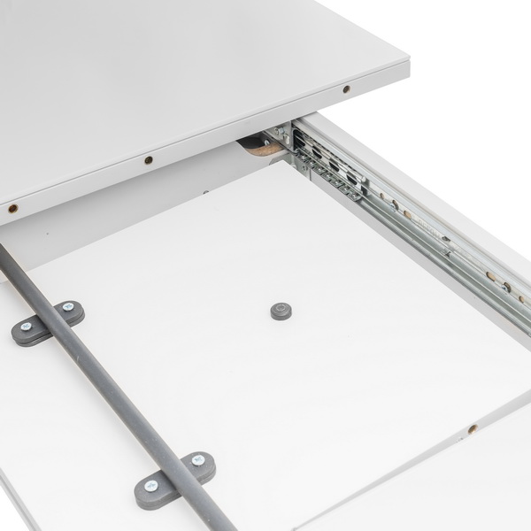 С помощью шариковых направляющих столешница раздвигается, дополнительная вставка из ЛДСП легко раскладывается одной рукой, увеличивая при этом длину стола до 126 см. Ножки стола регулируются на неровном полу до 15 мм.