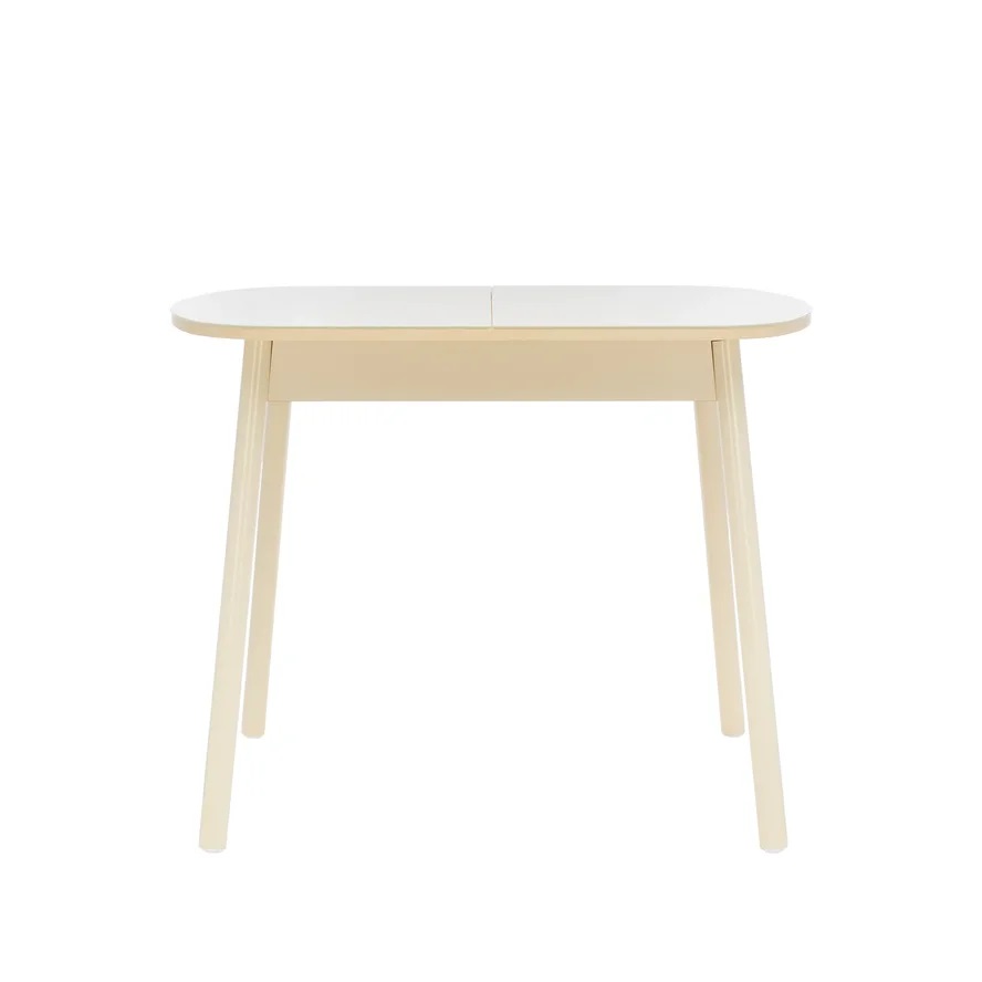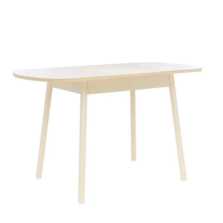 Небольшой обеденный стол Ронда крем. Длина столешницы в сложенном виде - 94 см, изготовлена она из прочного закаленного стекла толщиной 4 мм, выдерживает нагрев до 180 градусов.