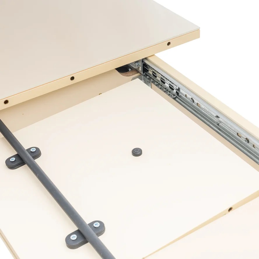 С помощью шариковых направляющих столешница раздвигается, дополнительная вставка из ЛДСП легко раскладывается одной рукой, увеличивая при этом длину стола до 126 см. Ножки стола регулируются на неровном полу до 15 мм.
