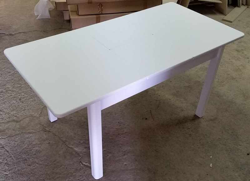Раздвижной прямоугольный стол. Столешница выполнена из ЛМДФ и покрыта пленкой ПВХ. Ноги металлические, крашенные в цвет корпуса; либо хром.