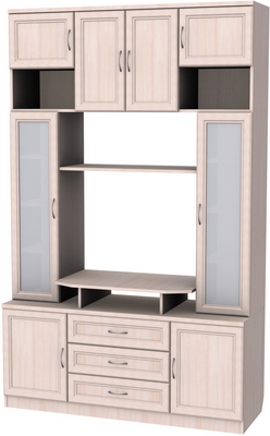 Основное предназначение тумбы, как это понятно из названия – создать комфортную зону для просмотра ТВ. Большая центральная ниша позволяет установить в ней даже самый большой экран. Под полками для ТВ есть небольшая ниша для размещения проигрывателя дисков. Над телевизором предусмотрена полка для фотографий и всевозможных элементов декора.