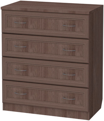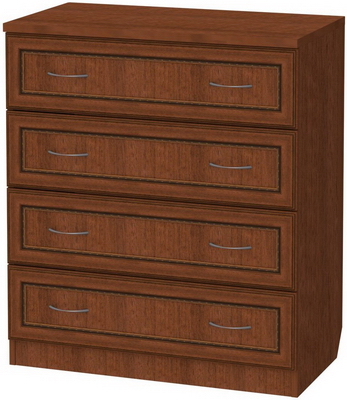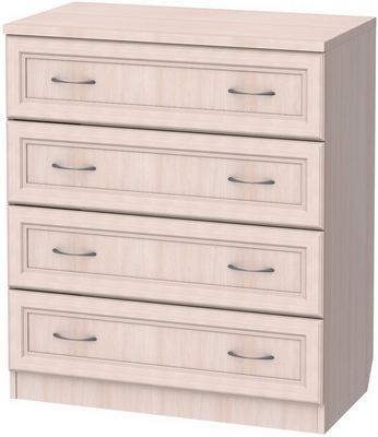 Комод оборудован четырьмя ящичками, дополненными выдвижным механизмом, в которых можно хранить различные вещи. Механизм движения состоит из прочных металлических и пластмассовых элементов, которые способны выдержать не одну сотню закрываний и открываний. Довольно часто такие комоды устанавливают в детских комнатах, поскольку в них очень удобно хранить одежду для детей. Ящички оснащены металлическими ручками удобной формы и дополнительным декоративным украшением в форме правильного четырехугольника, которое подчеркивает строгую красоту и изысканность этого предмета мебели. Внутреннее пространство выдвижных ящичков довольно большое, что позволяет хранить даже постельные принадлежности, благодаря чему комоды нередко располагают в спальных комнатах.