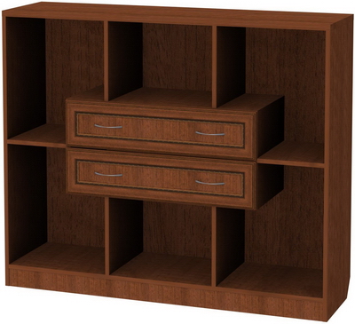 Остальное пространство, ограниченное стенками стеллажа, открыто. Оно разбито на 4 секции своеобразной геометрической формы, что позволяет раскладывать и расставлять в них предметы наиболее удобным образом. Если использовать этот предмет обстановки в офисе, то эти ячейки могут служить в качестве полок для книг и бумаг, в них можно разложить демонстрационные материалы либо расставить офисную технику.